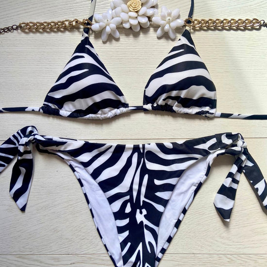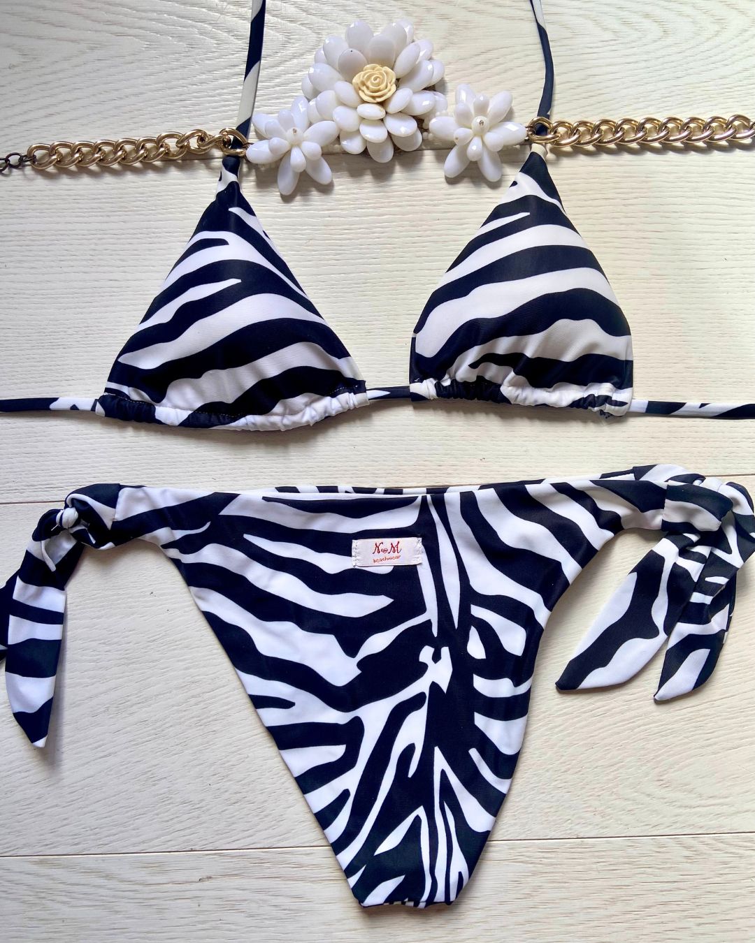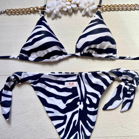 Kimberly è il bikini must-have dell’estate; realizzato in lycra zebrata black and white, moderno e versatile, combina triangolo con lacci regolari , triangolo con lacci girovita e fascia monospalla con slip chiusa sui fianchi, slip con fiocchi e slip con laccetti regolabili.