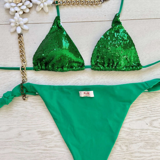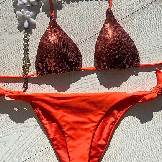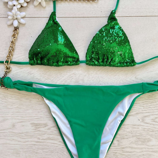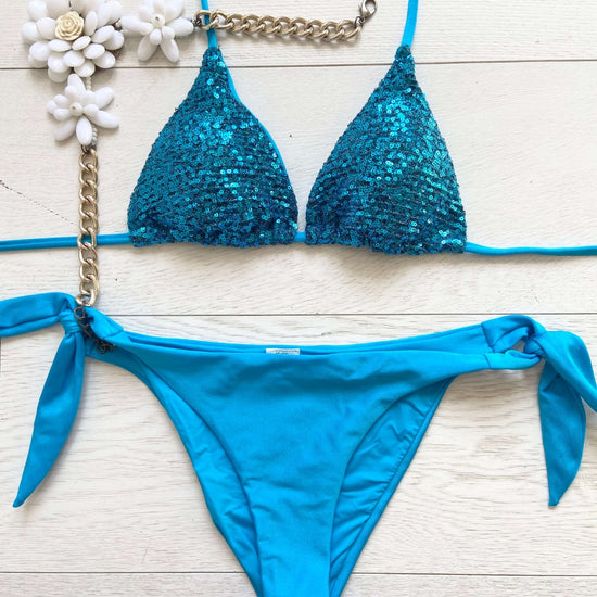 Glittering" a triangolo in paillettes, un'autentica creazione Made in Italy che cattura l'energia scintillante di questa stagione. Le luminose paillettes conferiscono un tocco di eleganza giocosa, riflettendo la luce con irresistibile brillantezza. Le coppette estraibili garantiscono un comfort personalizzato, mentre il fascino artigianale italiano brilla in ogni dettaglio.