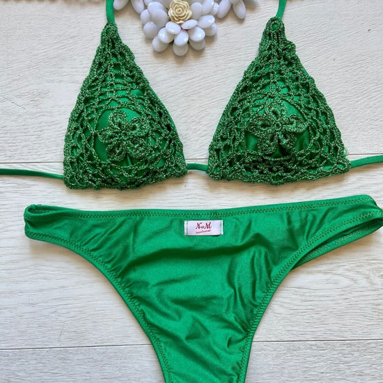 Questo modello è l'Iconic Crochet Emerald a Triangolo con slip senza laccetti. Contattaci e richiedi qualsiasi personalizzazione per creare il tuo modello esclusivo!