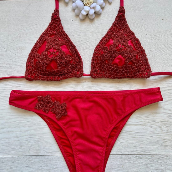Questo modello è l'Iconic Crochet Red Passion a Triangolo con slip senza laccetti. Contattaci e richiedi qualsiasi personalizzazione per creare il tuo modello esclusivo!