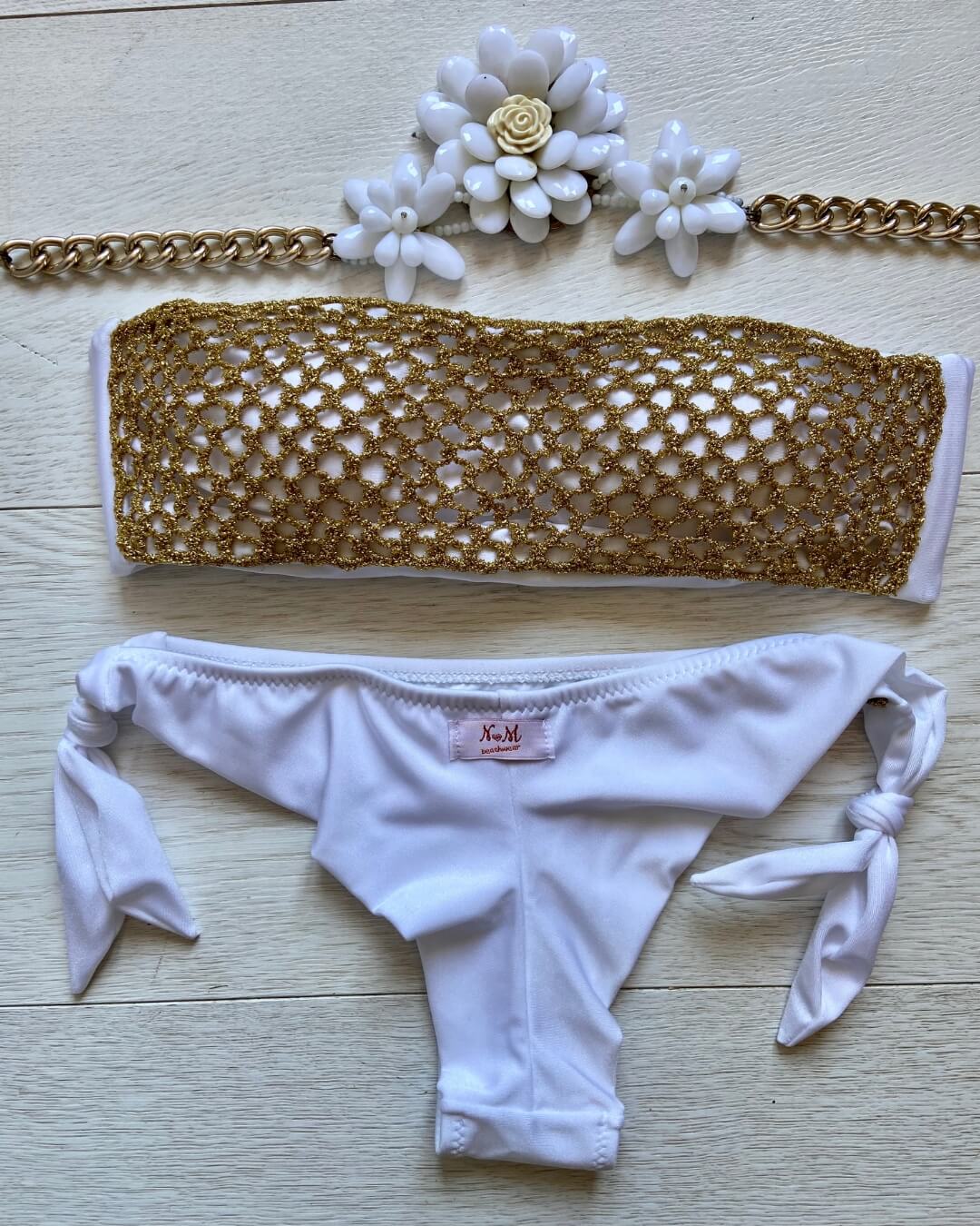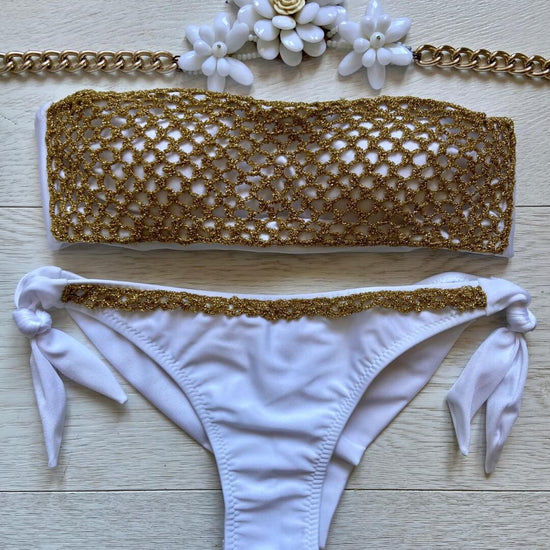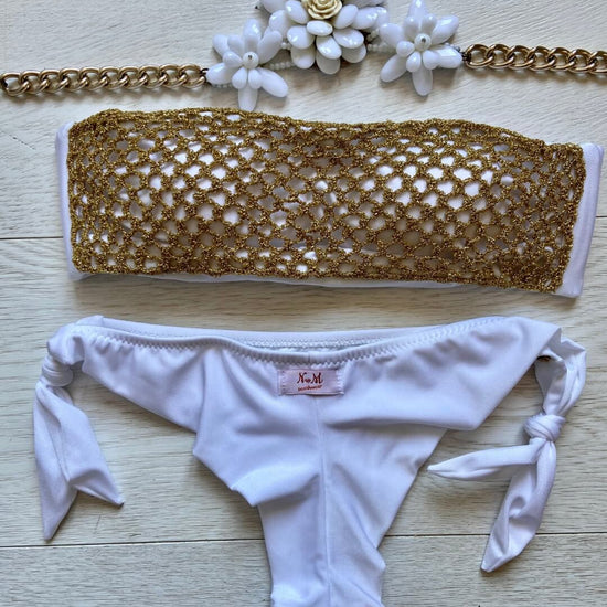 Questo modello è l'Iconic Crochet White&Gold a Fascia con slip con laccetti. Contattaci e richiedi qualsiasi personalizzazione per creare il tuo modello esclusivo!
