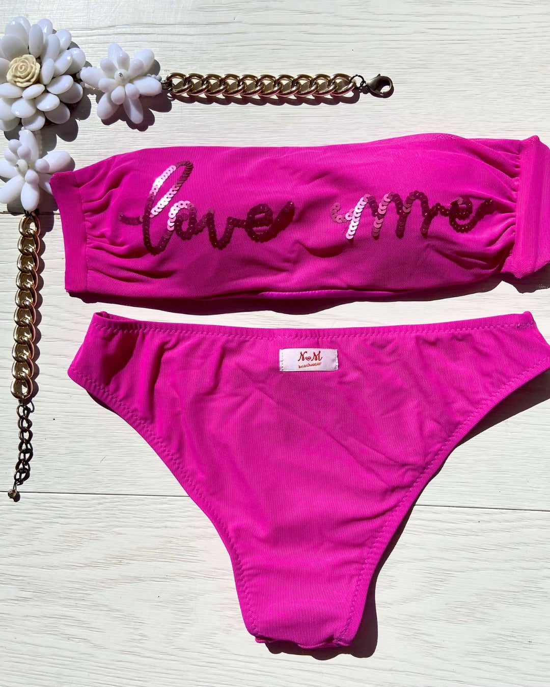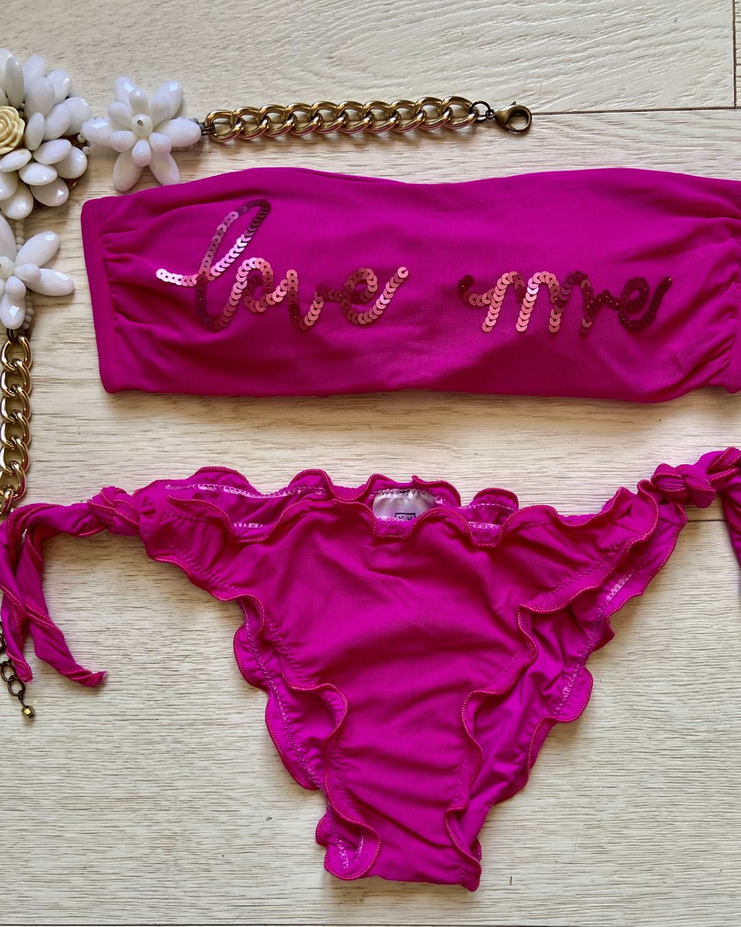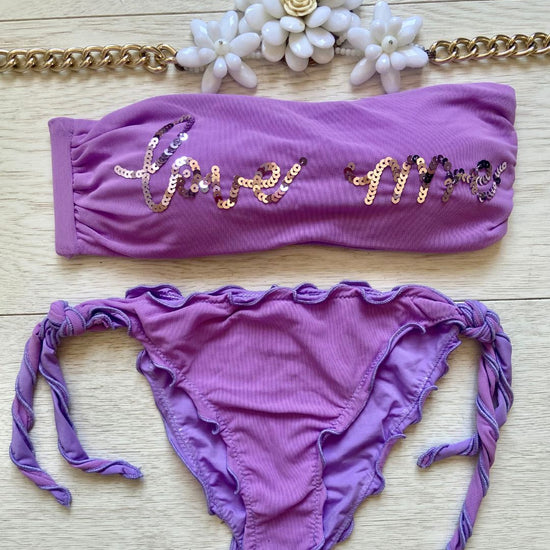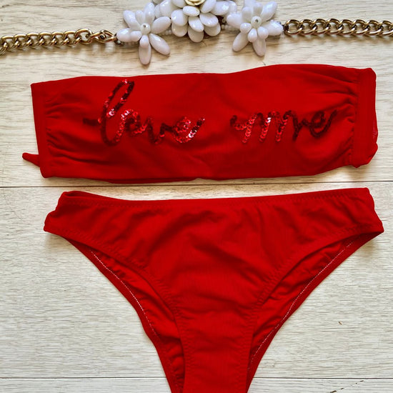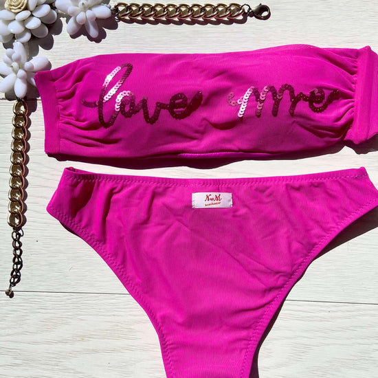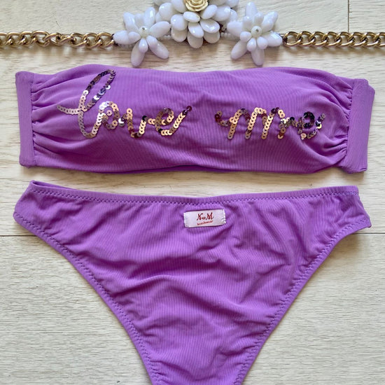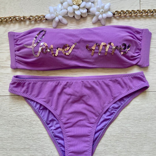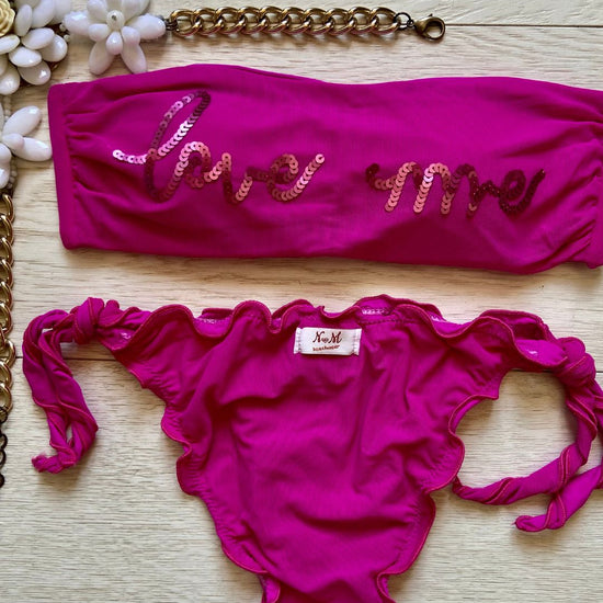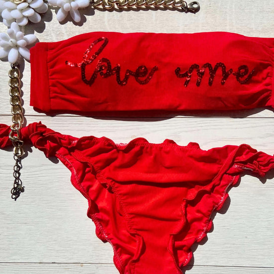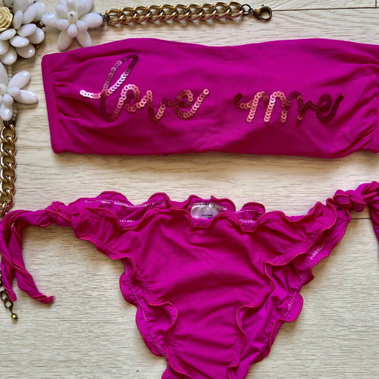 La caratteristica principale del bikini "Love me" è la sua affascinante fascia in microrete, impreziosita dalla scritta "Love me" ricamata con paillettes scintillanti. Questo dettaglio distintivo aggiunge un tocco di glamour e positività al tuo look da spiaggia. Le coppette estraibili modellano il tuo décolleté secondo le tue preferenze, garantendo comfort e sostegno.