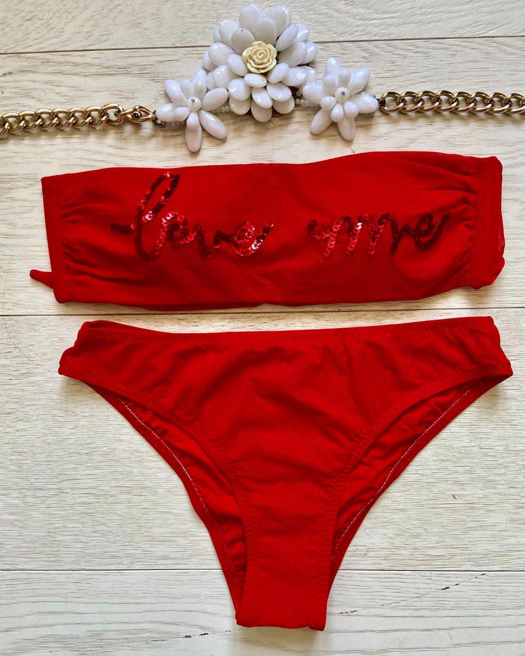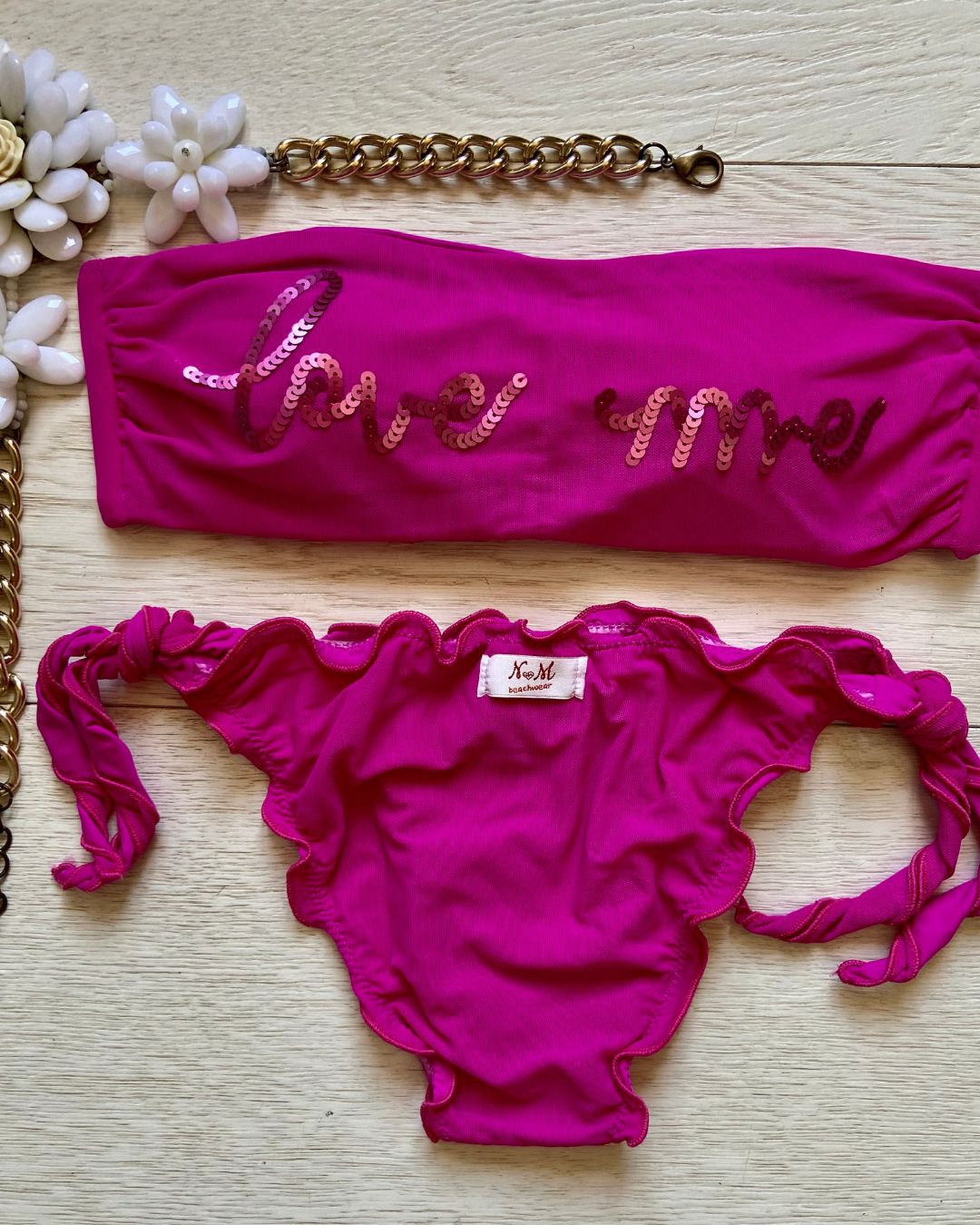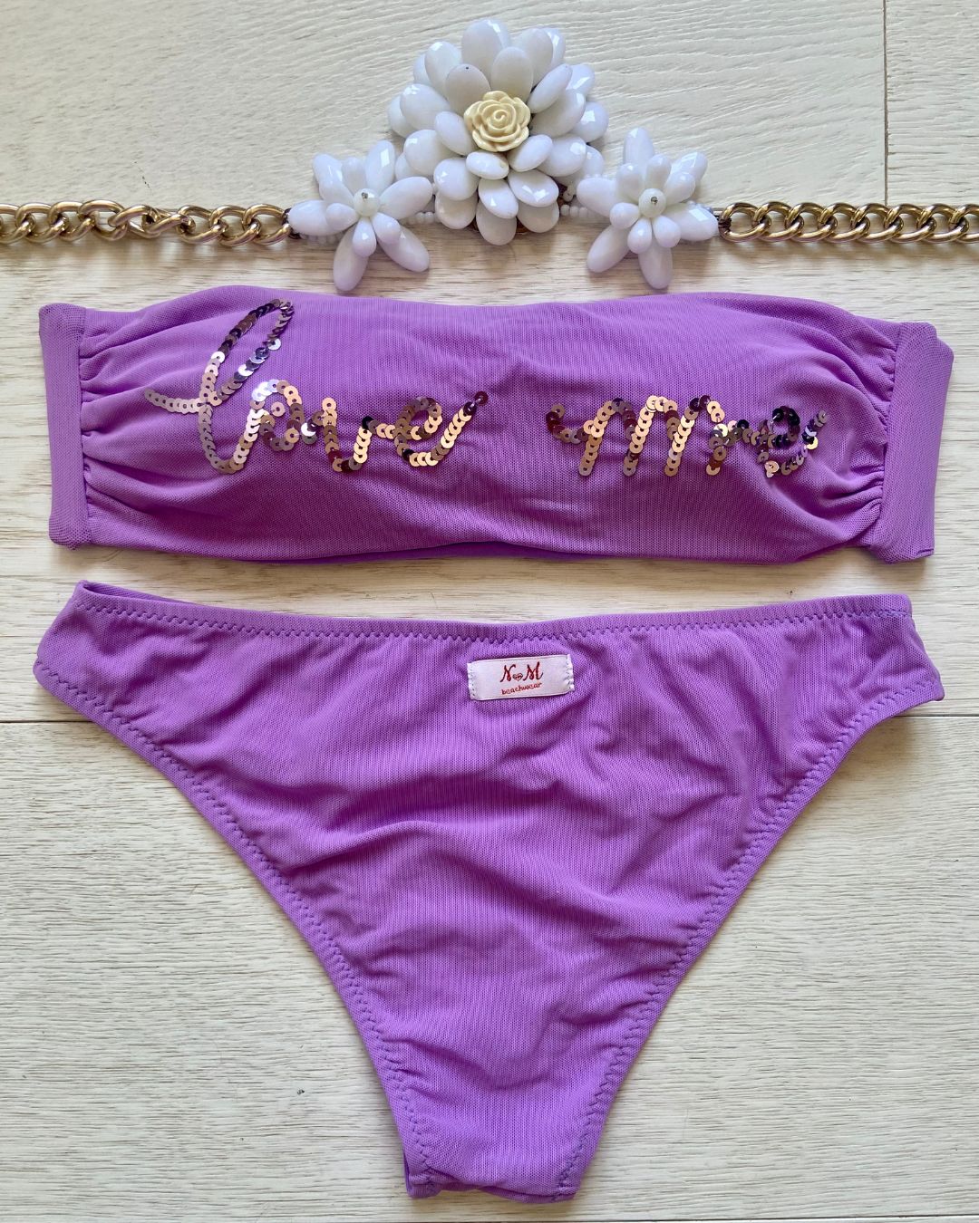 La caratteristica principale del bikini "Love me" è la sua affascinante fascia in microrete, impreziosita dalla scritta "Love me" ricamata con paillettes scintillanti. Questo dettaglio distintivo aggiunge un tocco di glamour e positività al tuo look da spiaggia. Le coppette estraibili modellano il tuo décolleté secondo le tue preferenze, garantendo comfort e sostegno.
