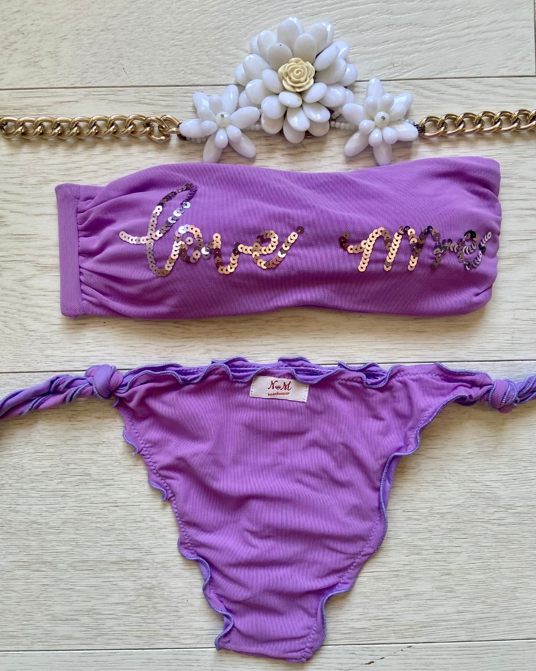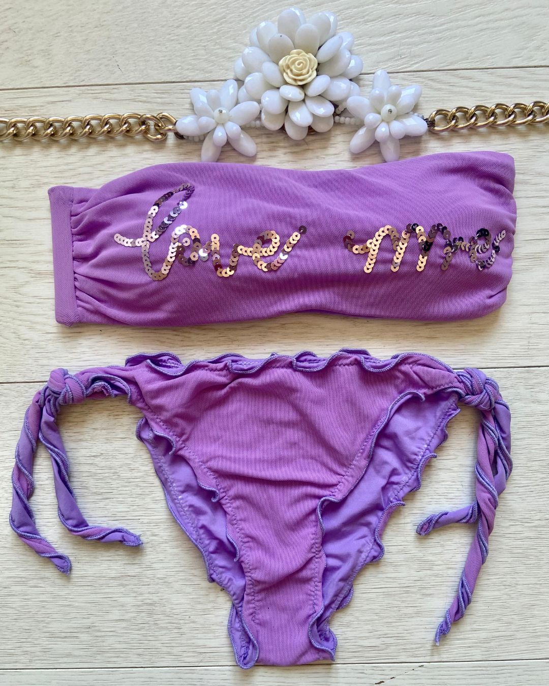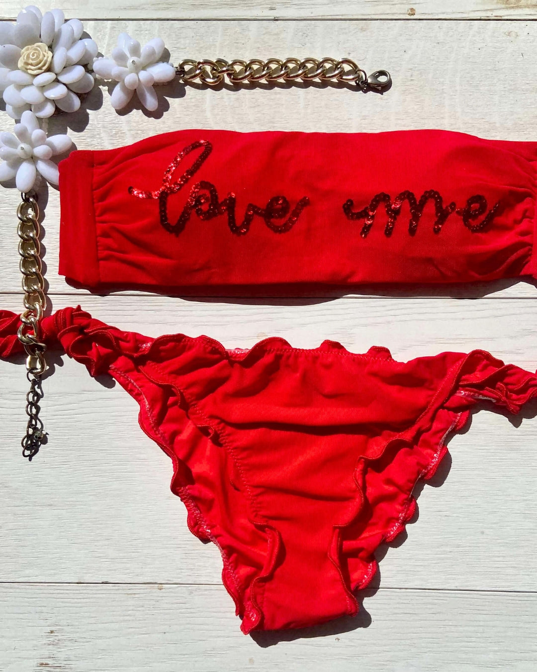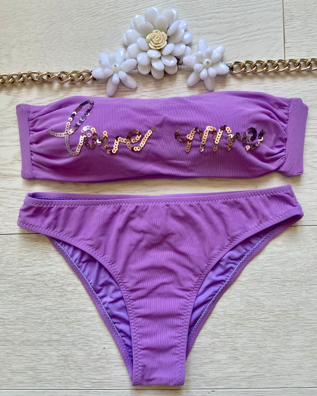 La caratteristica principale del bikini "Love me" è la sua affascinante fascia in microrete, impreziosita dalla scritta "Love me" ricamata con paillettes scintillanti. Questo dettaglio distintivo aggiunge un tocco di glamour e positività al tuo look da spiaggia. Le coppette estraibili modellano il tuo décolleté secondo le tue preferenze, garantendo comfort e sostegno.