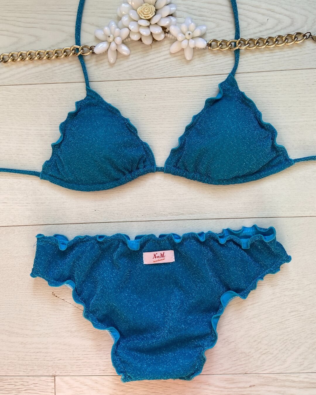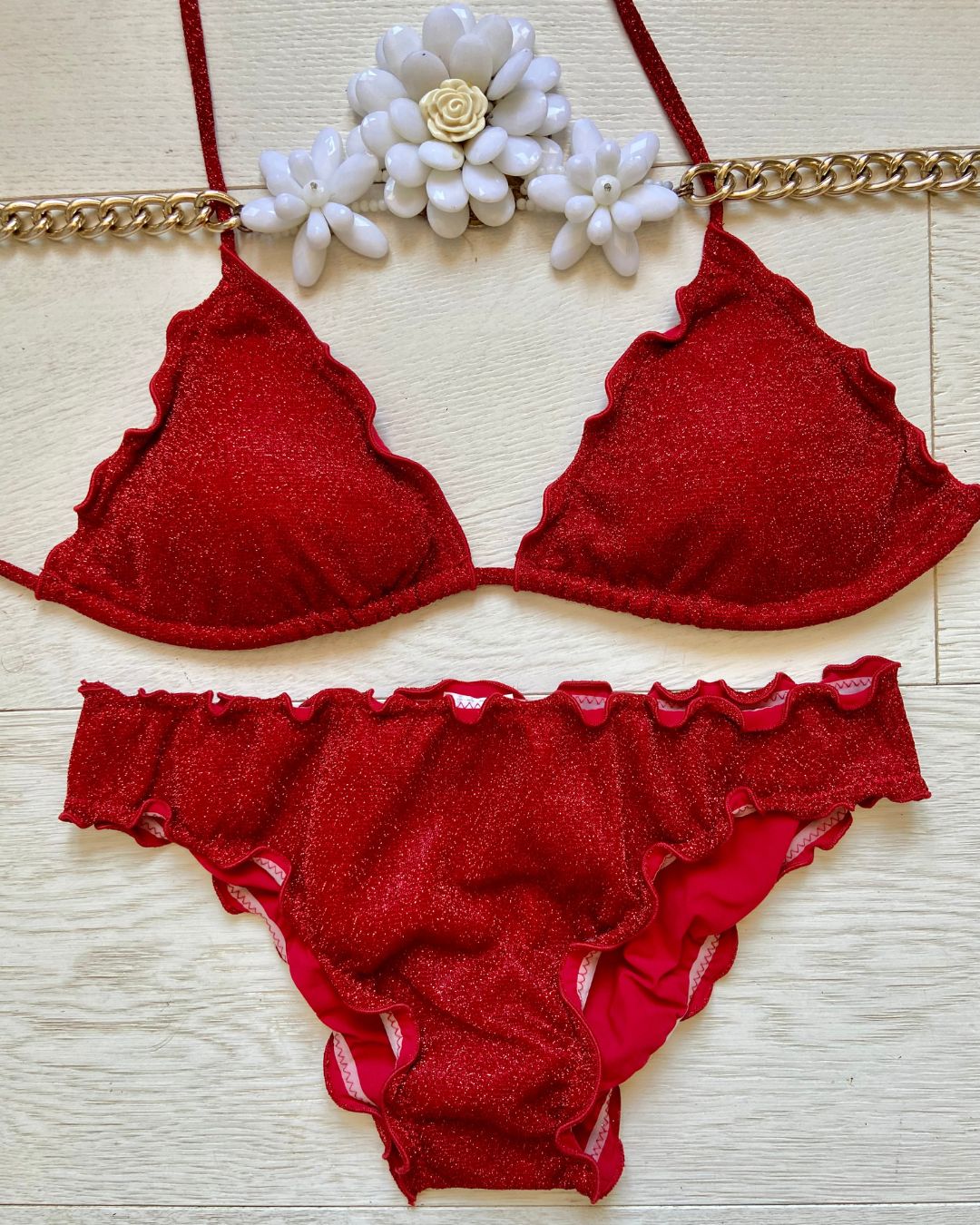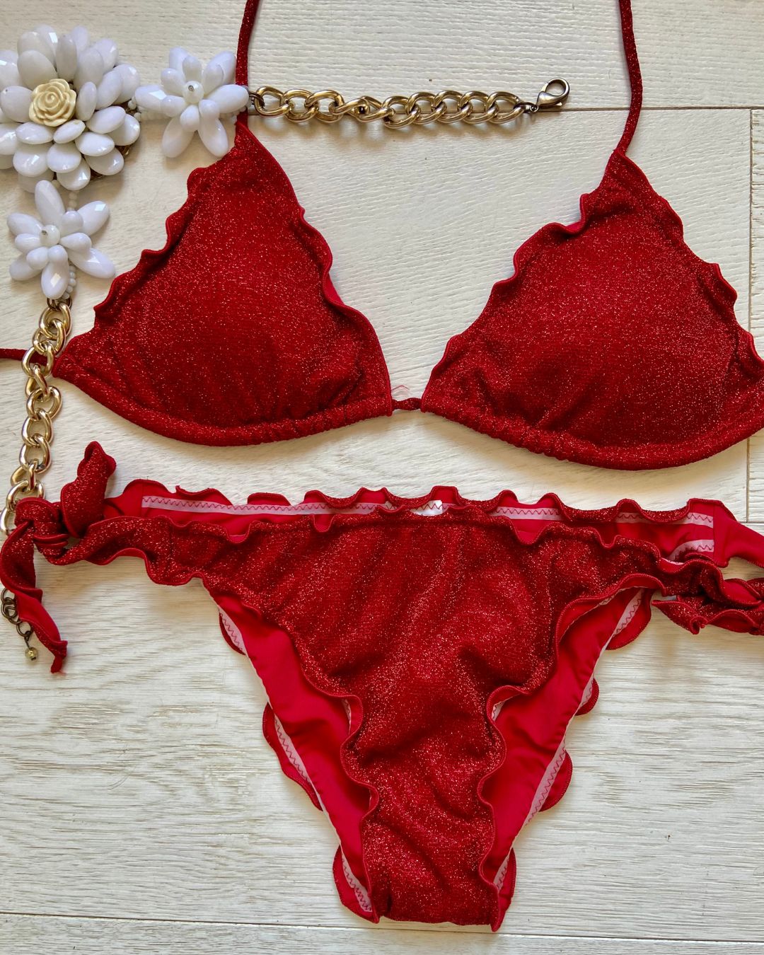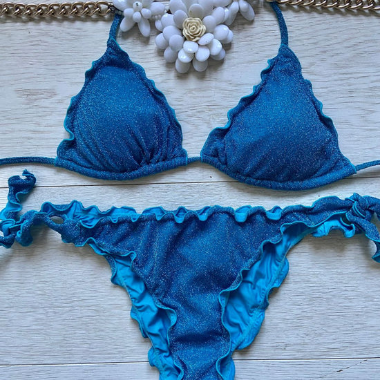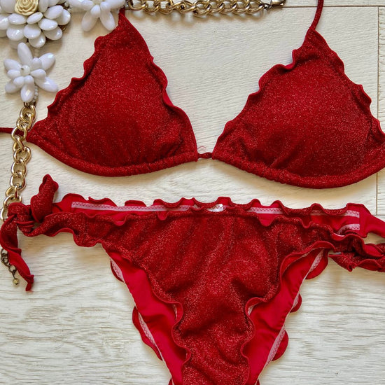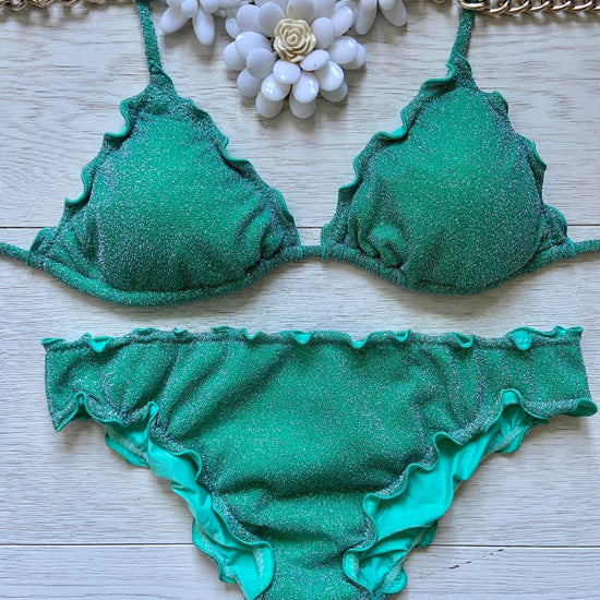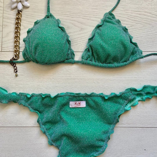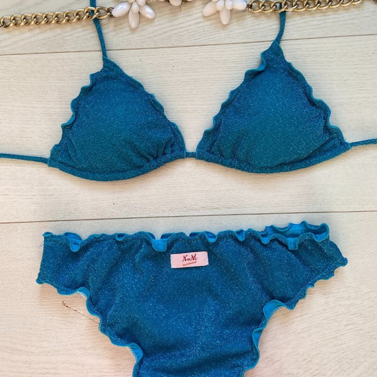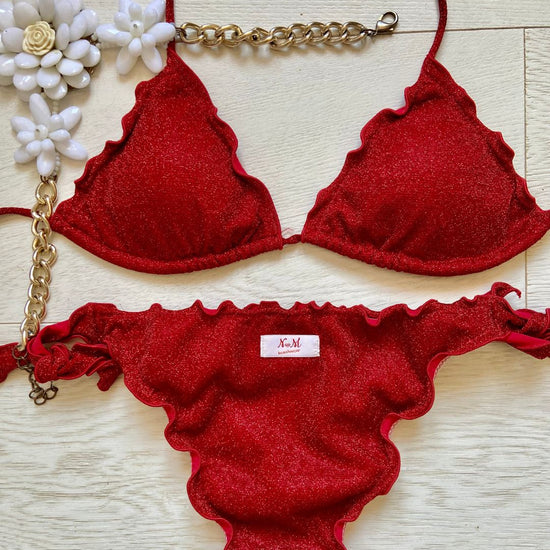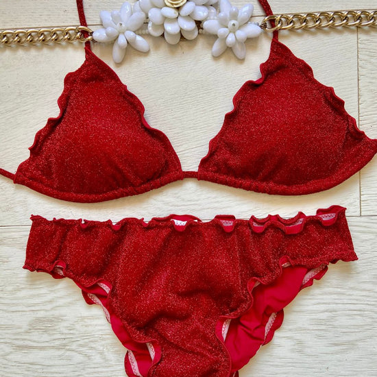 Bikini realizzato in maglina lurex elastica a triangolo con coppette estraibili, slip con laccetti o senza. Disponibile in 3 colorazioni: Turchese, Acquamarina e Rosso.