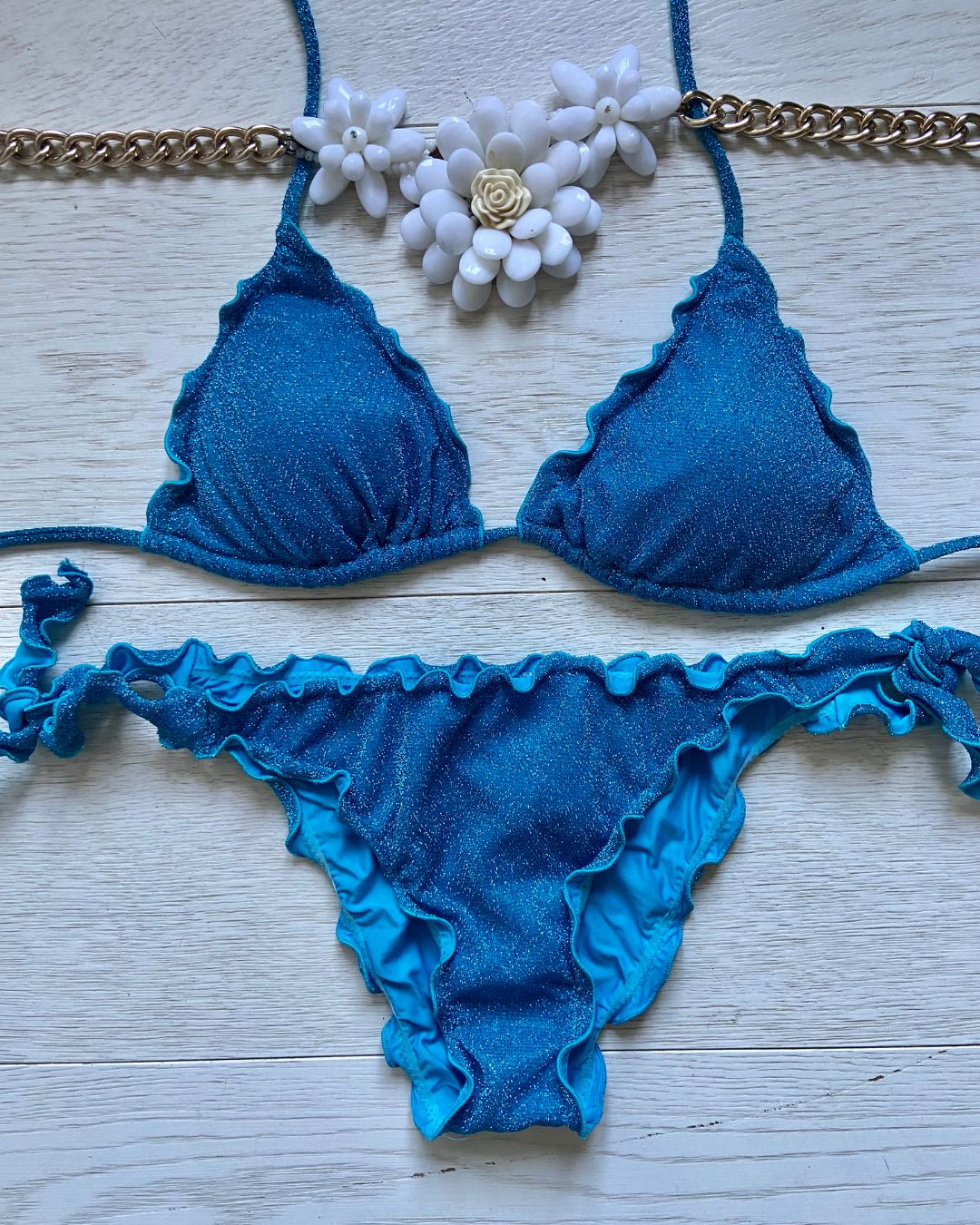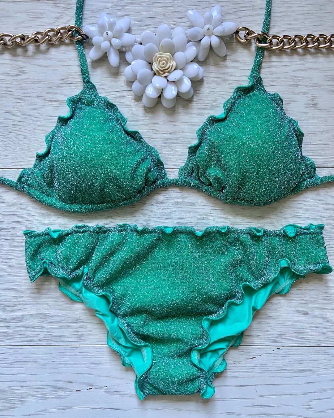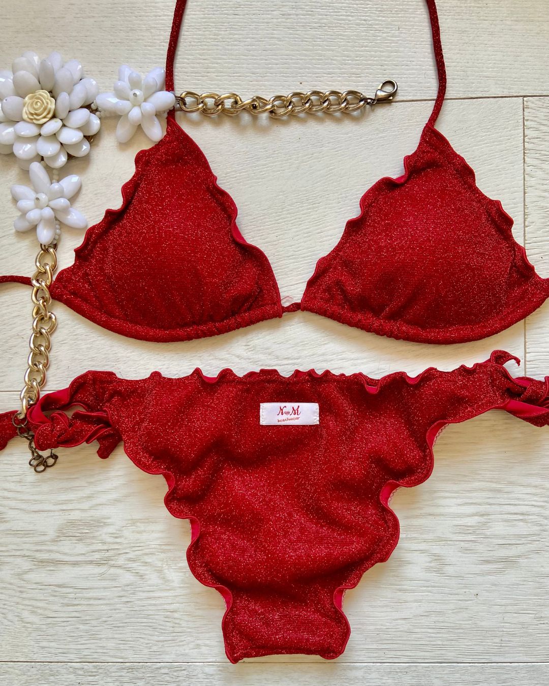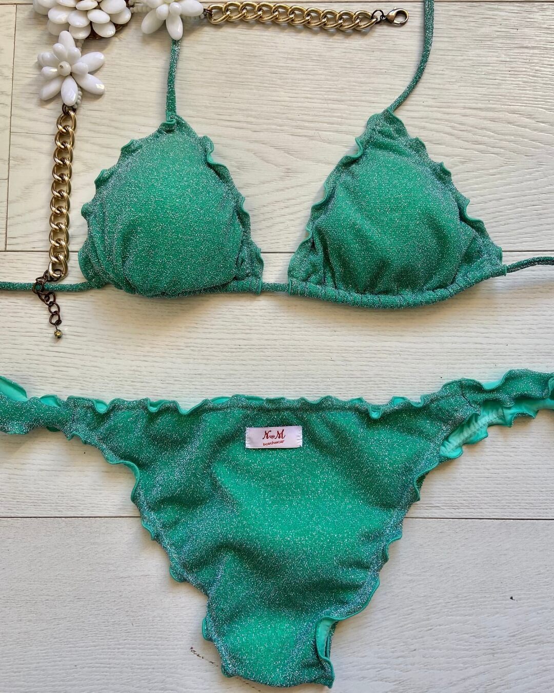 Bikini realizzato in maglina lurex elastica a triangolo con coppette estraibili, slip con laccetti o senza. Disponibile in 3 colorazioni: Turchese, Acquamarina e Rosso.